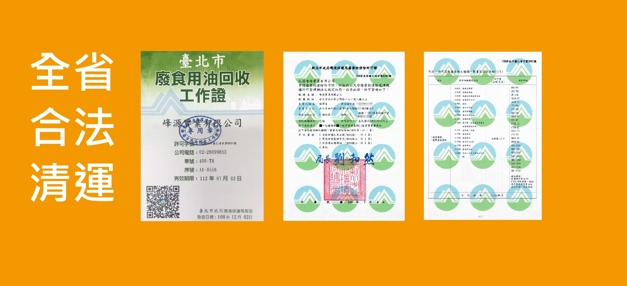 峰源實業有限公司自民國八十六年成立, 本公司之前身峰源商行,自民國八十一年成立,本公司依循環保之理念,從事回收廢食用油回收已經超過二十年,民國九十六年九月,環保署規定事業廢棄物上網申報流向,本公司許可證編號為「108新北市廢乙清字第0091號」本公司也已配合政府之規定申報,管制編號F17B1014。決無不法之事,符合政府之政策。